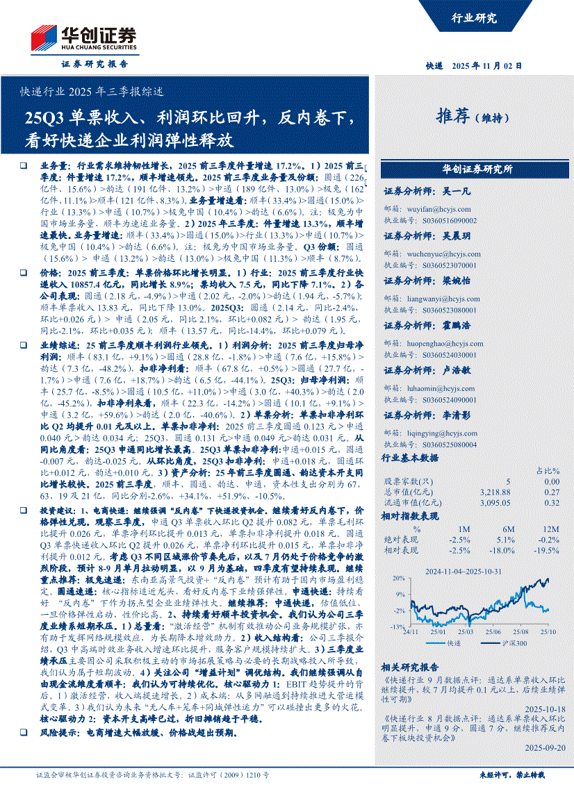 快递行业:华创证券-快递行业2025年三季报综述:25Q3单票收入、利润环比回升,反内卷下,看好快递企业利润弹性释放-251102