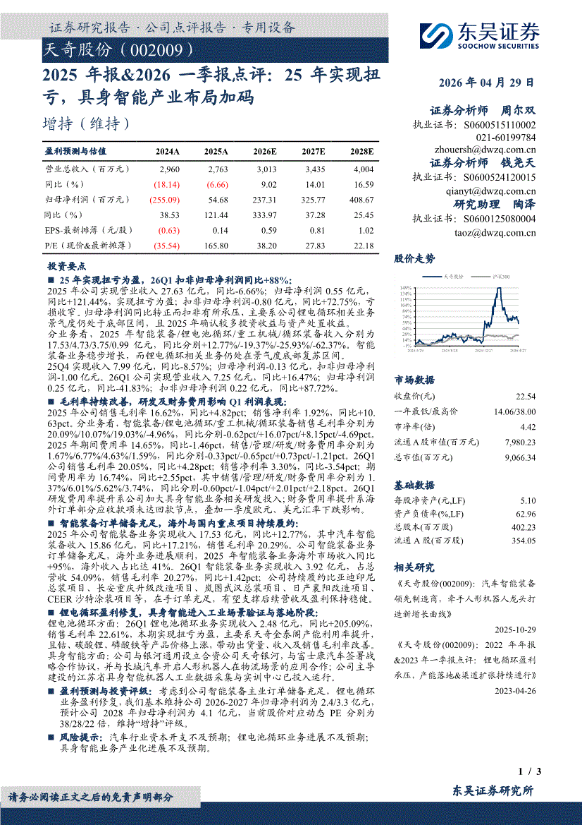 天奇股份:东吴证券-天奇股份-002009-2025年报&2026一季报点评:25年实现扭亏,具身智能产业布局加码-260429