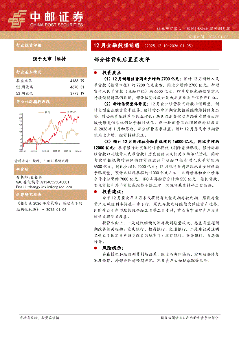 银行业:中邮证券-银行业12月金融数据前瞻:部分信贷或后置至次年-260108