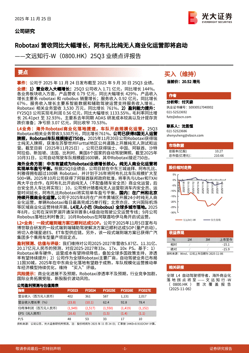 文远知行~W:光大证券-文远知行~W-0800.HK-25Q3业绩点评报告:Robotaxi营收同比大幅增长,阿布扎比纯无人商业化运营即将启动-251125