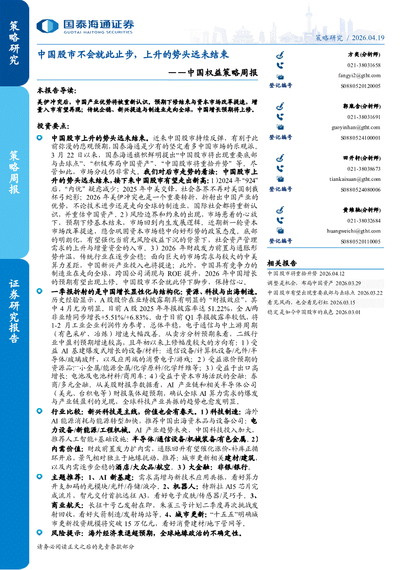 国泰海通证券-中国权益策略周报:中国股市不会就此止步,上升的势头远未结束-260419