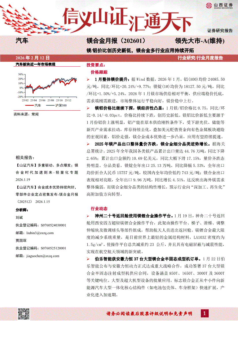 汽车行业:山西证券-汽车行业镁合金月报:镁铝价比创历史新低,镁合金多行业应用持续开拓-260212