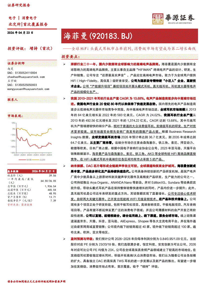 海菲曼:华源证券-海菲曼-920183-全球HiFi头戴式耳机市占率前列,消费级市场有望成为第二增长曲线-260423