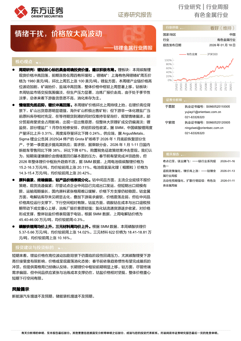 有色金属行业:东方证券-钴锂金属行业周报:情绪干扰,价格放大高波动-260118