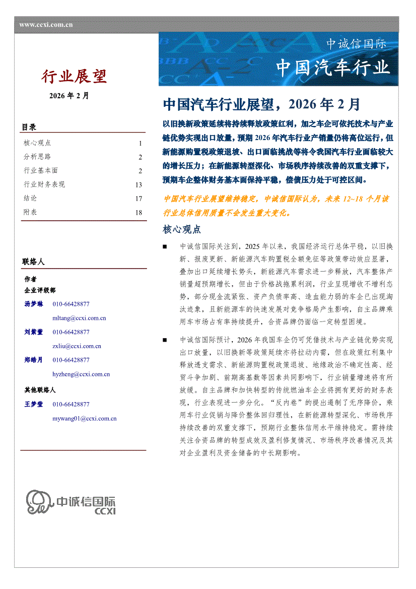 汽车行业:中诚信国际-中国汽车行业展望,2026年2月-260206