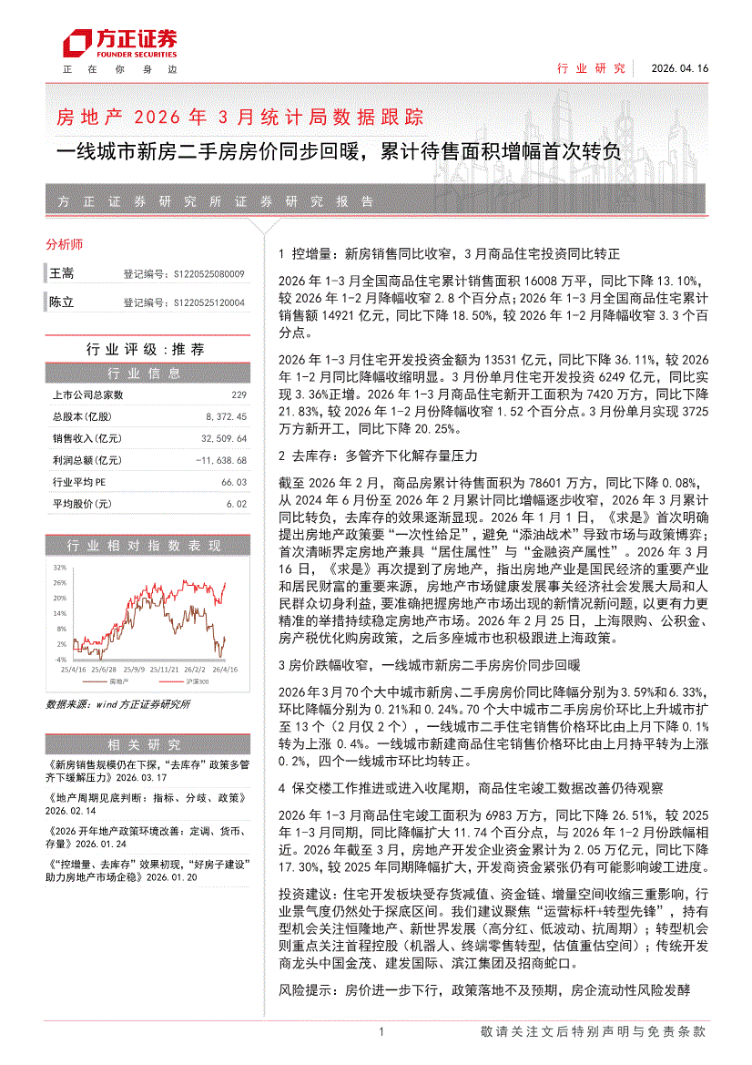 房地产行业:方正证券-房地产行业2026年3月统计局数据跟踪:一线城市新房二手房房价同步回暖,累计待售面积增幅首次转负-260416