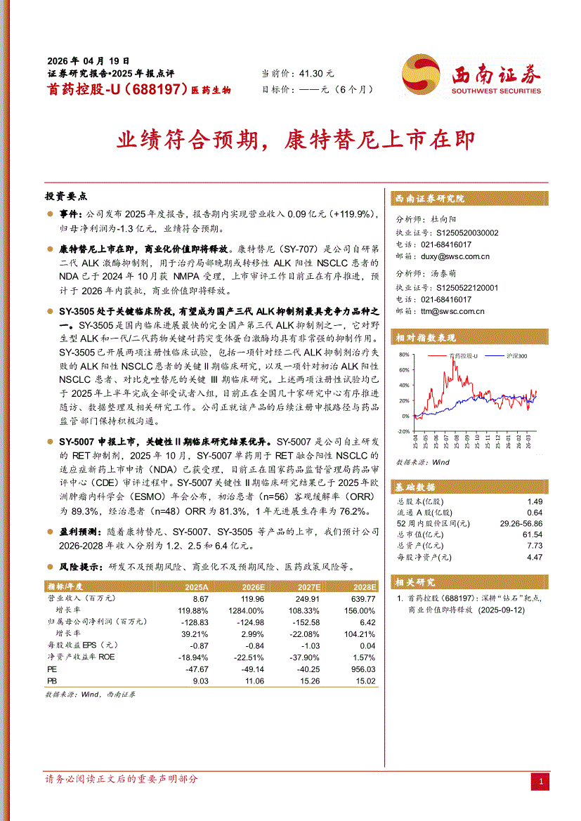 首药控股:西南证券-首药控股-688197-业绩符合预期,康特替尼上市在即-260419