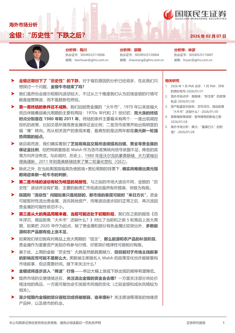 国联民生证券-海外市场分析:金银,“历史性”下跌之后?-260207