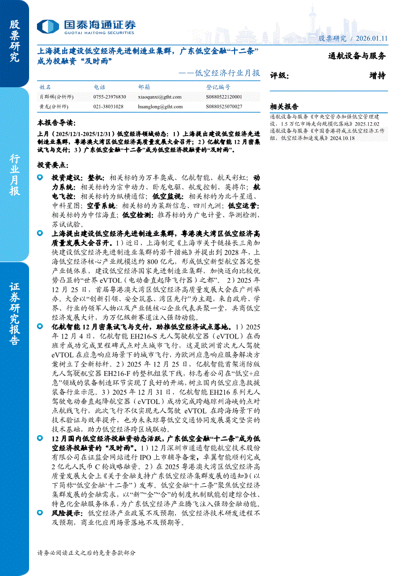 低空经济行业:国泰海通证券-低空经济行业月报:上海提出建设低空经济先进制造业集群,广东低空金融“十二条”成为投融资“及时雨”-260111