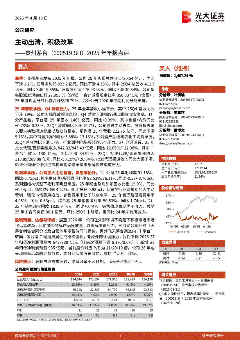 贵州茅台:光大证券-贵州茅台-600519-2025年年报点评:主动出清,积极改革-260419
