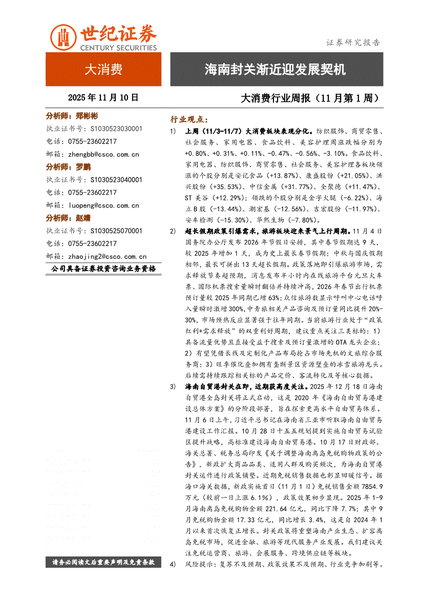 世纪证券-大消费行业周报(11月第1周):海南封关渐近迎发展契机-251110