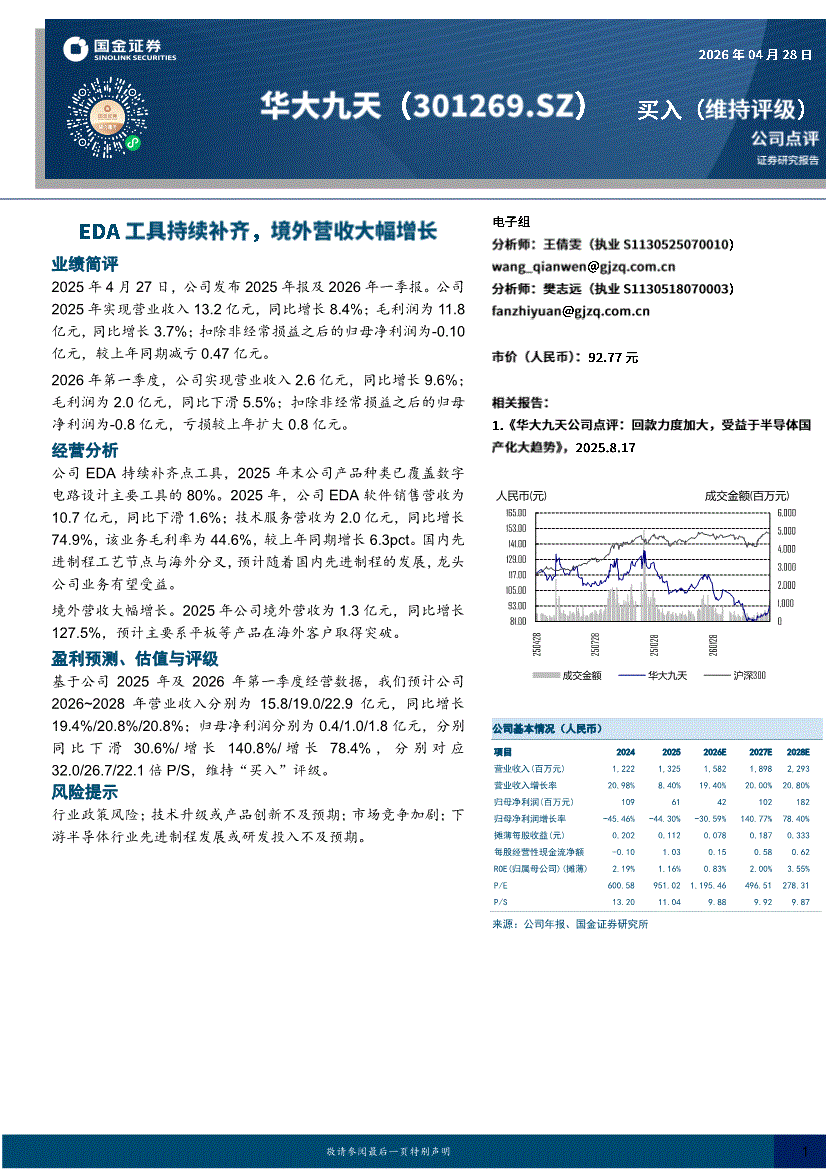 华大九天:国金证券-华大九天-301269-EDA工具持续补齐,境外营收大幅增长-260428