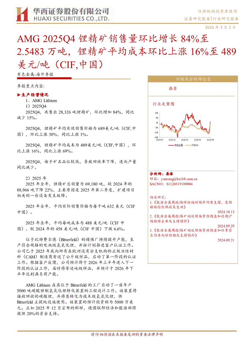有色金属行业:华西证券-有色金属行业~海外季报:AMG 2025Q4锂精矿销售量环比增长84%至2.5483万吨,锂精矿平均成本环比上涨16%至489美元/吨(CIF,中国)-260302