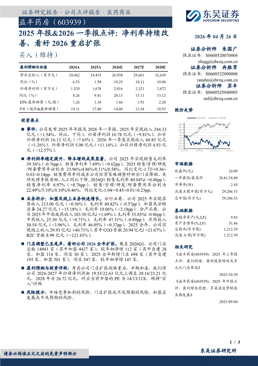益丰药房:东吴证券-益丰药房-603939-2025年报&2026一季报点评:净利率持续改善,看好2026重启扩张-260426