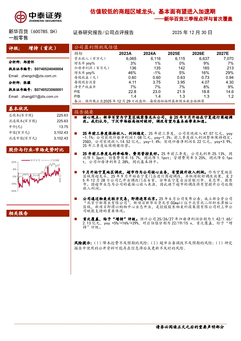 新华百货:中泰证券-新华百货-600785-三季报点评与首次覆盖:估值较低的商超区域龙头,基本面有望进入加速期-251230