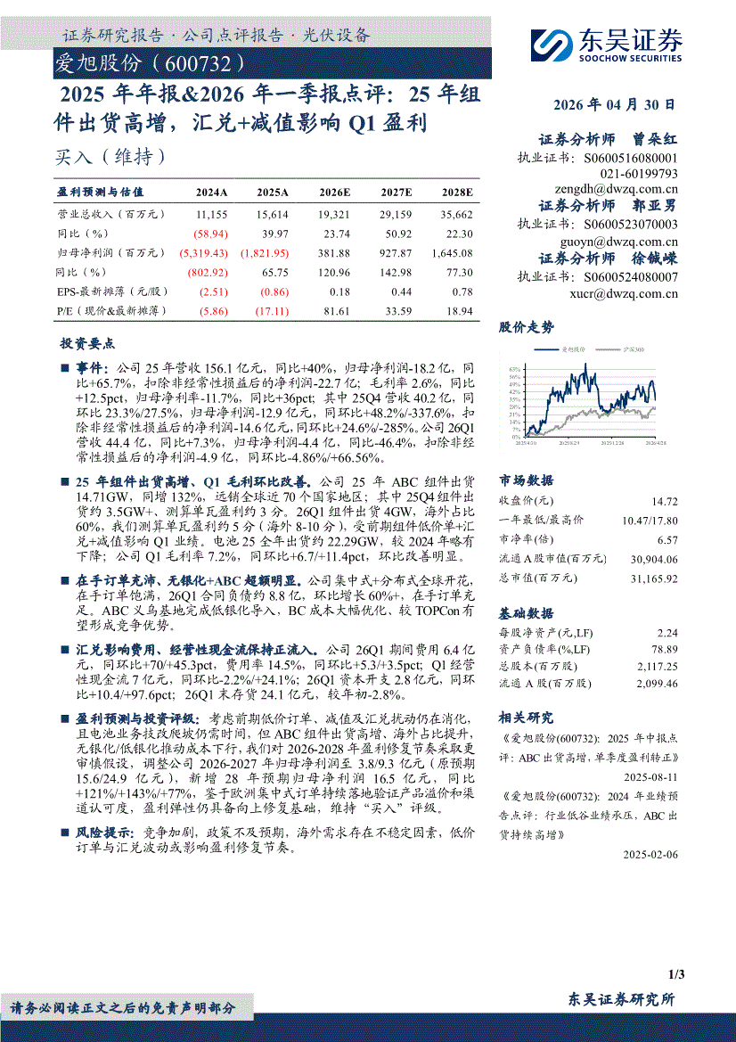 爱旭股份:东吴证券-爱旭股份-600732-2025年年报&2026年一季报点评:25年组件出货高增,汇兑+减值影响Q1盈利-260430