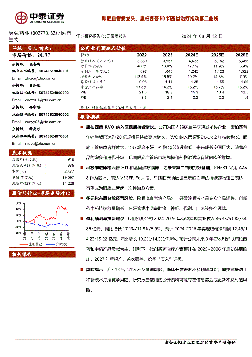 康弘药业:中泰证券-康弘药业-002773-眼底血管病龙头,康柏西普HD和基因治疗推动第二曲线-240812