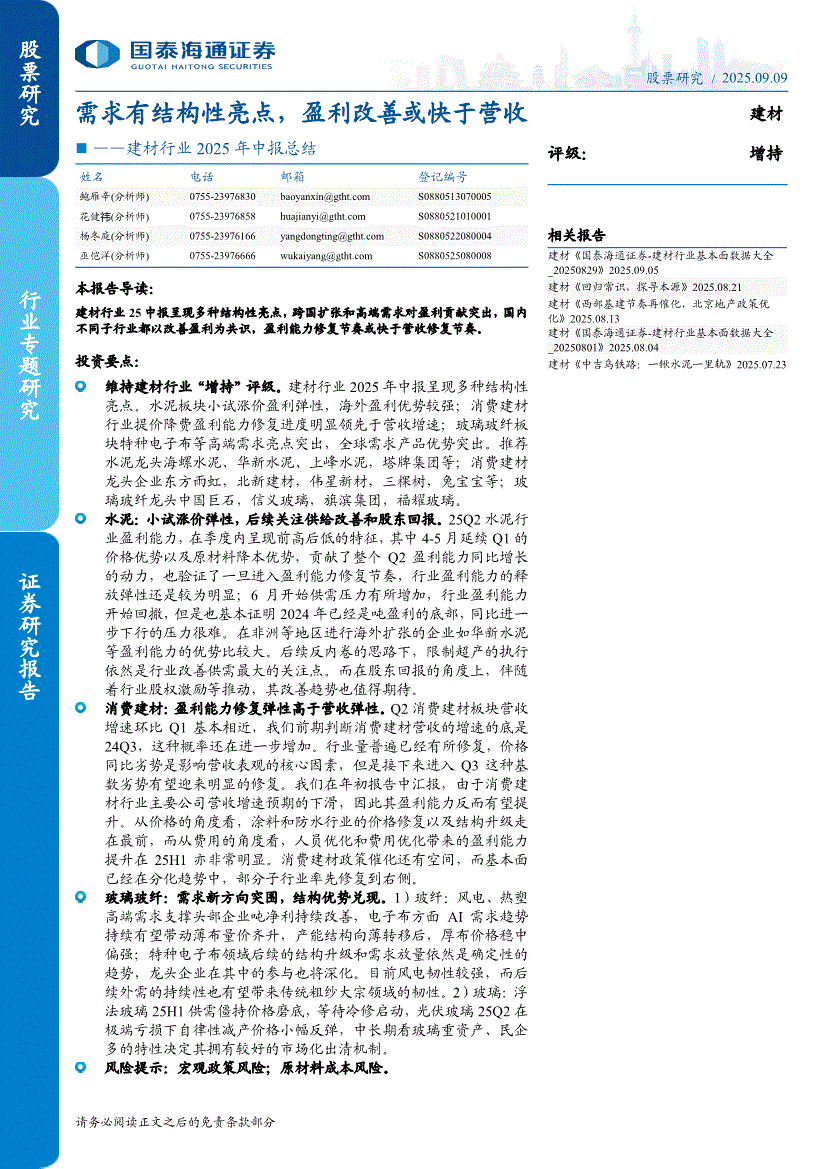 建材行业:国泰海通证券-建材行业2025年中报总结:需求有结构性亮点,盈利改善或快于营收-250909
