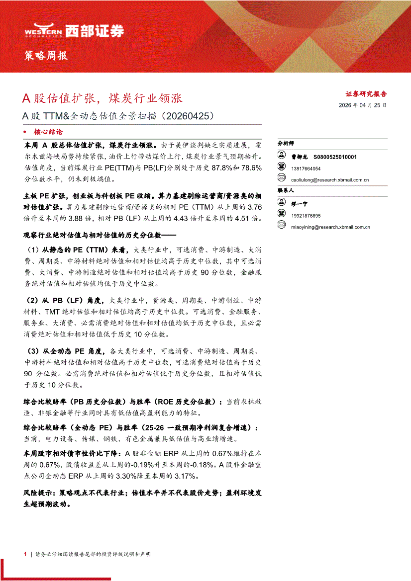 西部证券-策略周报:A股TTM&全动态估值全景扫描,A股估值扩张,煤炭行业领涨-260425
