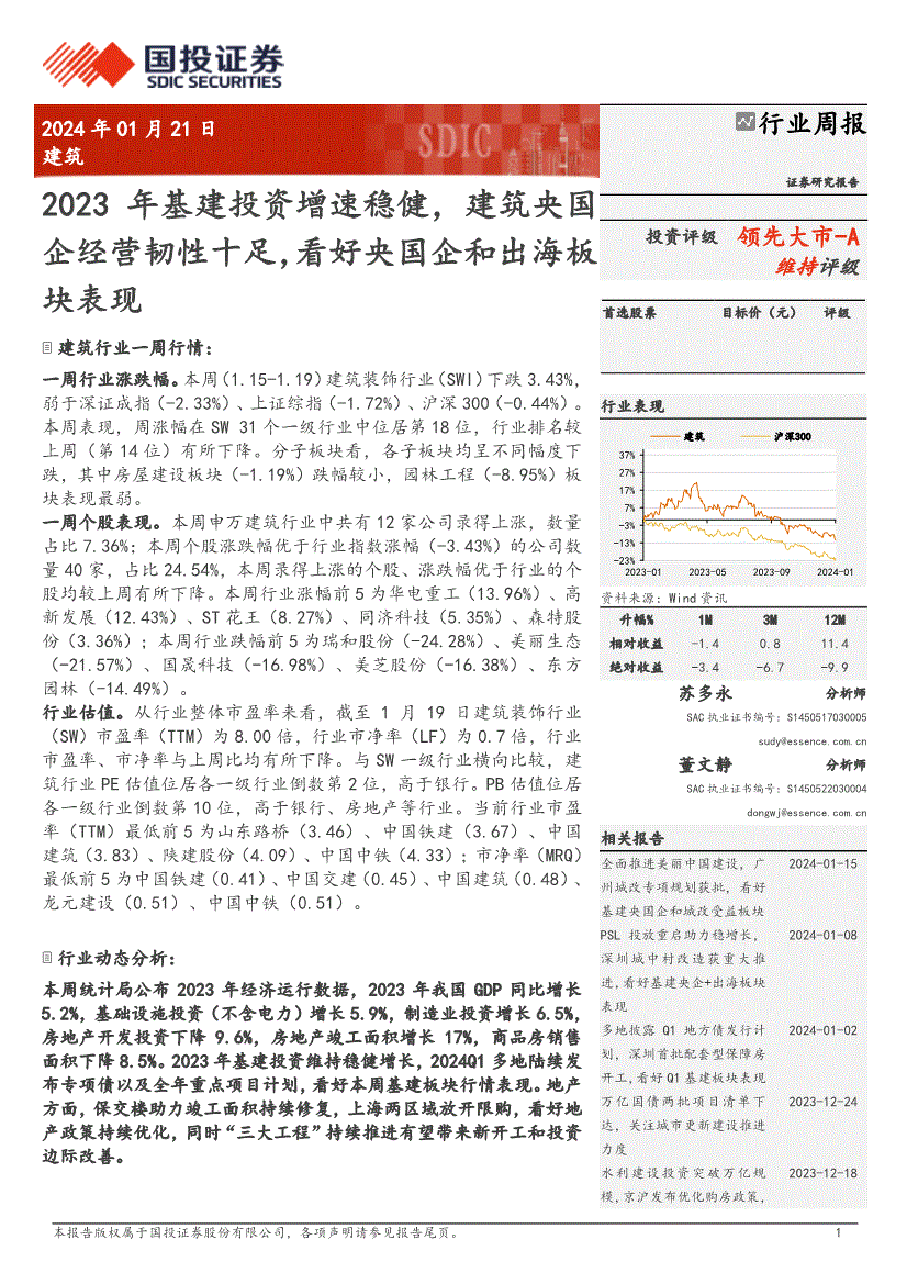 建筑行业:国投证券-建筑行业:2023年基建投资增速稳健,建筑央国企经营韧性十足,看好央国企和出海板块表现-240121