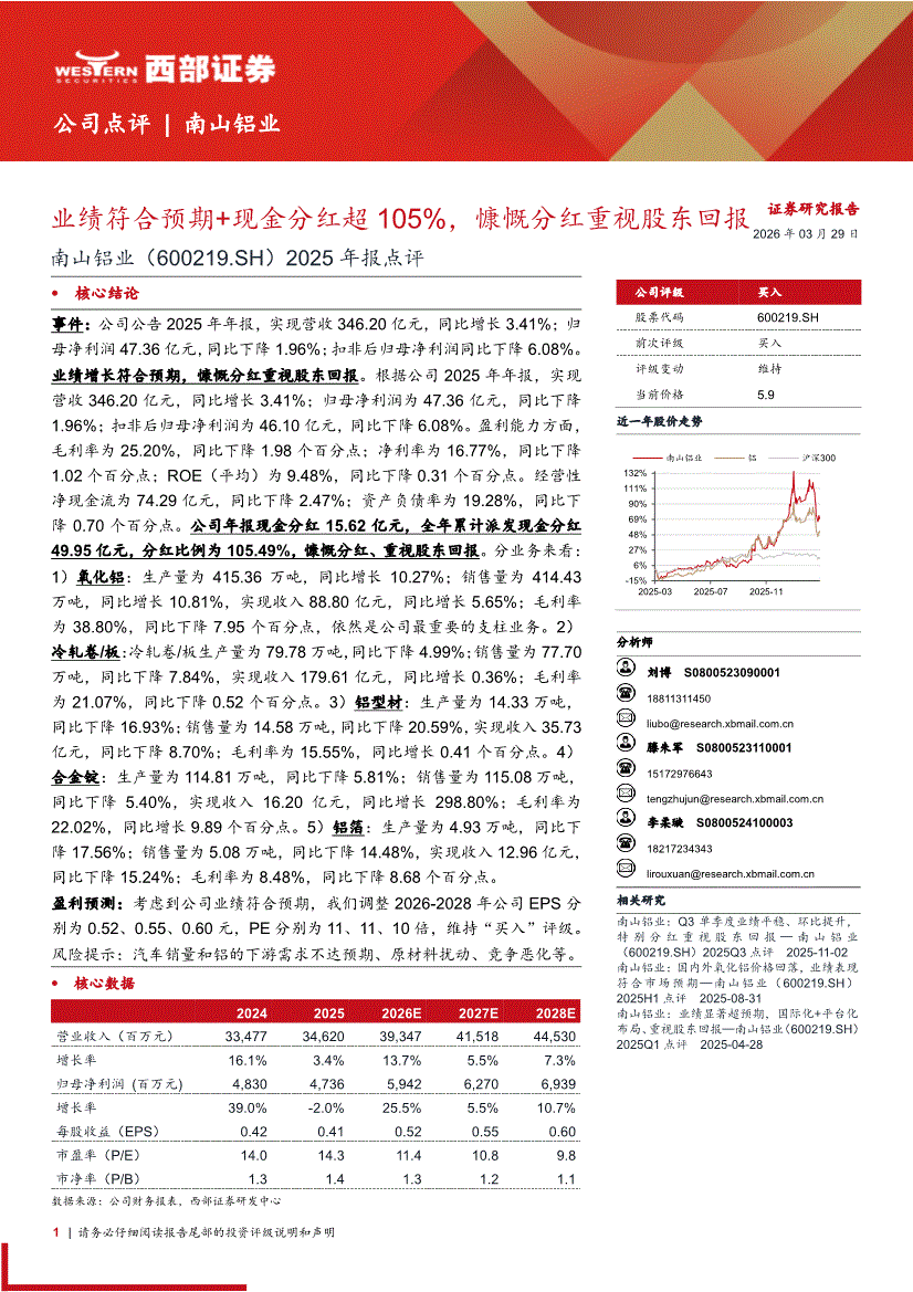 南山铝业:西部证券-南山铝业-600219-2025年报点评:业绩符合预期+现金分红超105%,慷慨分红重视股东回报-260329