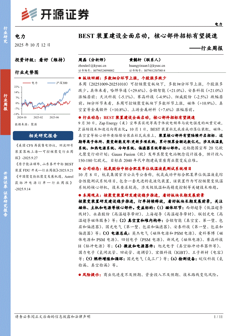 开源证券-电力行业周报:中国聚变抢抓聚变发展机遇,Astrol获脉冲电源订单-250913