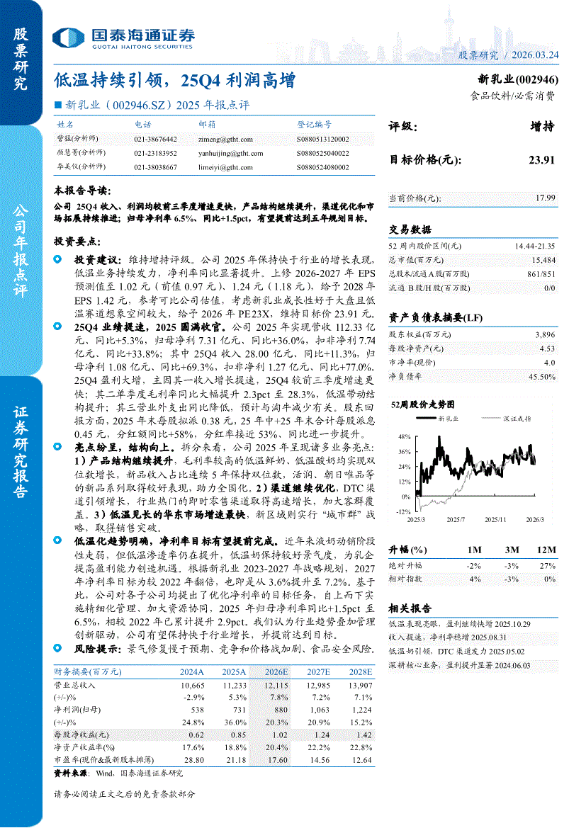 新乳业:国泰海通证券-新乳业-002946-2025年报点评:低温持续引领,25Q4利润高增-260324