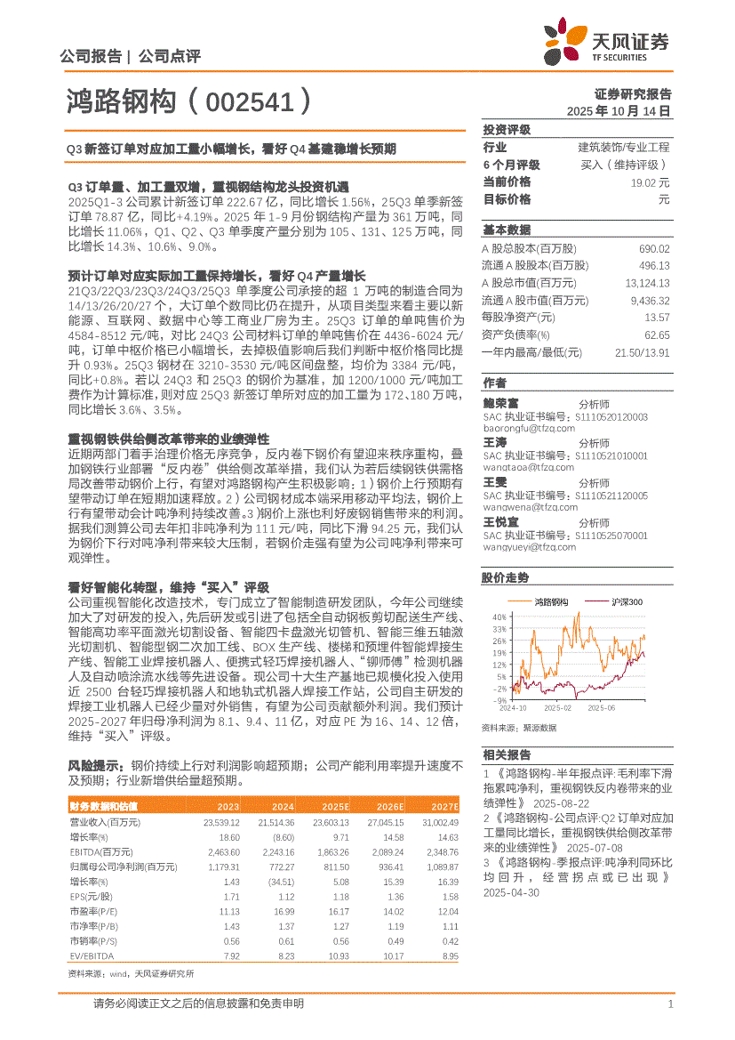 鸿路钢构:天风证券-鸿路钢构-002541-Q3新签订单对应加工量小幅增长,看好Q4基建稳增长预期-251014