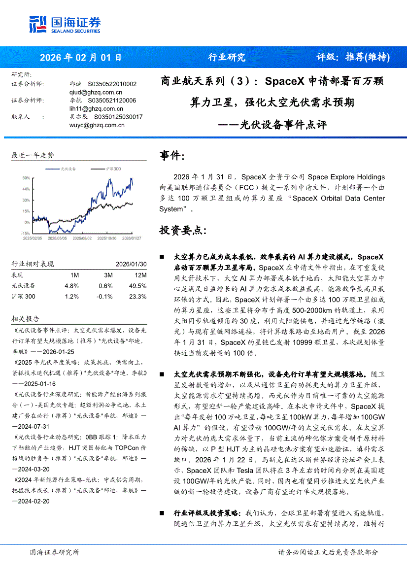 光伏设备行业:国海证券-光伏设备行业事件点评:商业航天系列(3),SpaceX申请部署百万颗算力卫星,强化太空光伏需求预期-260201