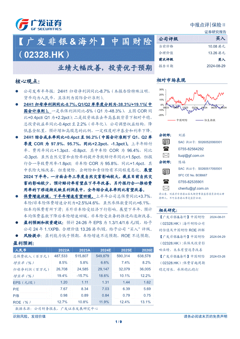 中国财险:广发证券-中国财险-2328.HK-业绩大幅改善,投资优于预期-240829