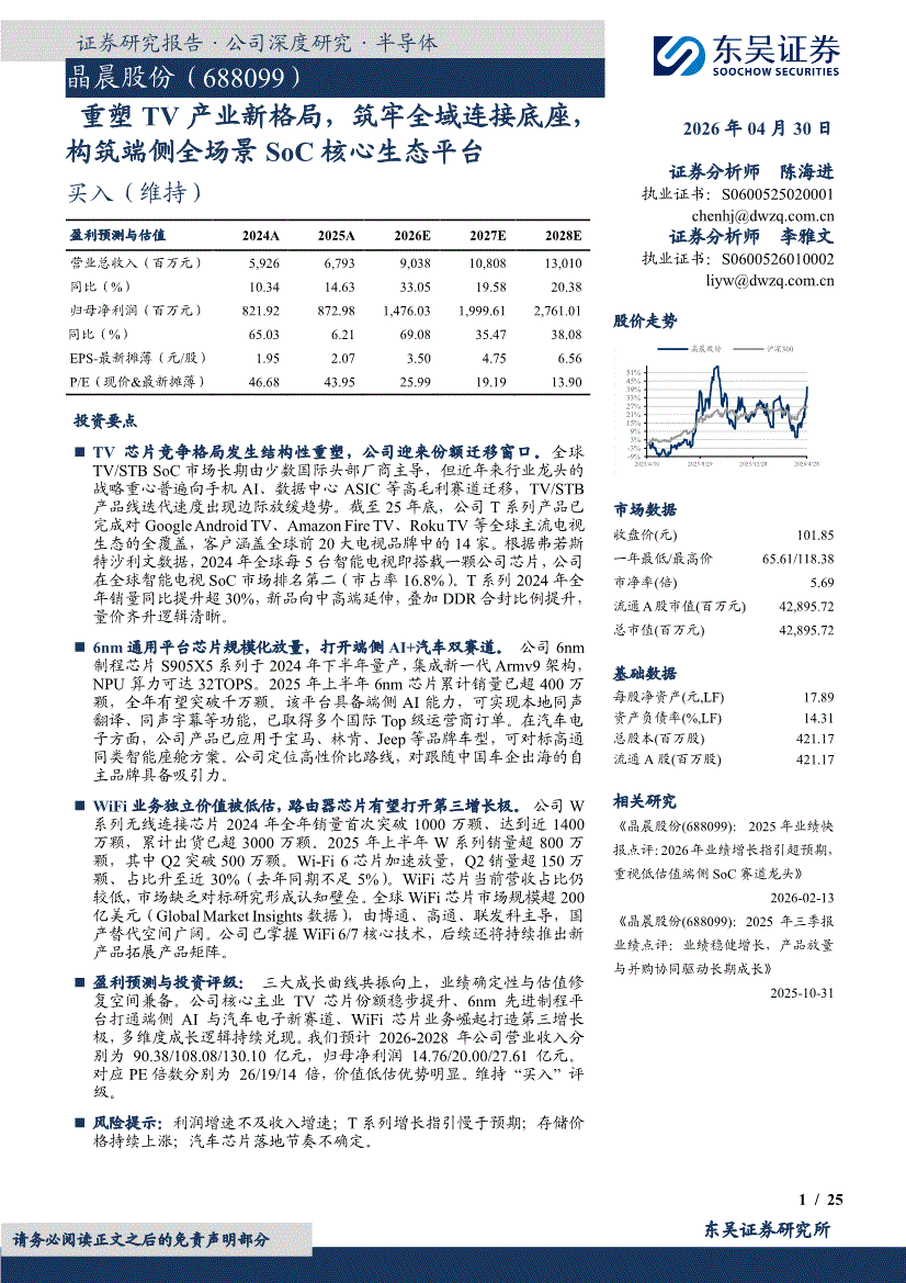 晶晨股份:东吴证券-晶晨股份-688099-重塑TV产业新格局,筑牢全域连接底座,构筑端侧全场景SoC核心生态平台-260430