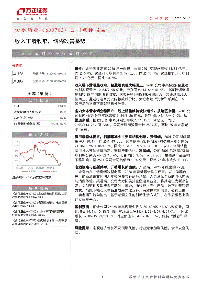 舍得酒业:方正证券-舍得酒业-600702-公司点评报告:收入下滑收窄,结构改善蓄势-260416