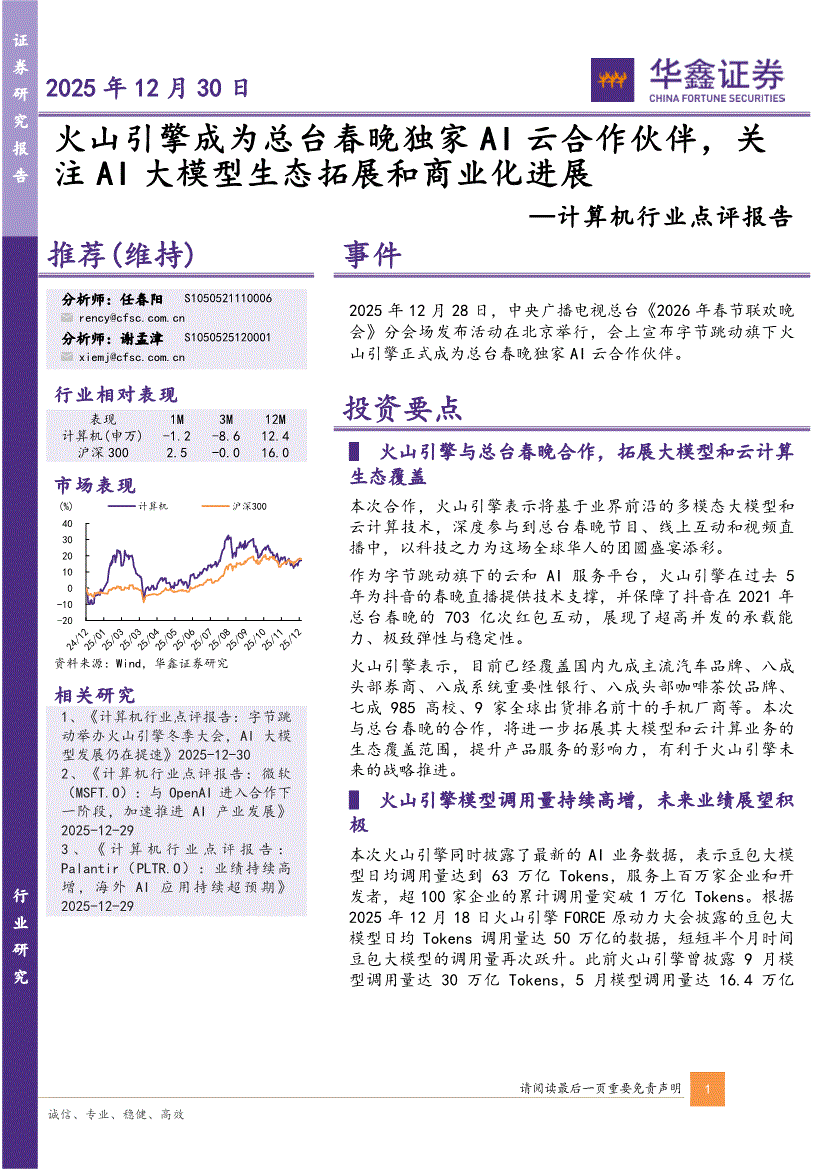计算机行业:华鑫证券-计算机行业点评报告:火山引擎成为总台春晚独家AI云合作伙伴,关注AI大模型生态拓展和商业化进展-251230