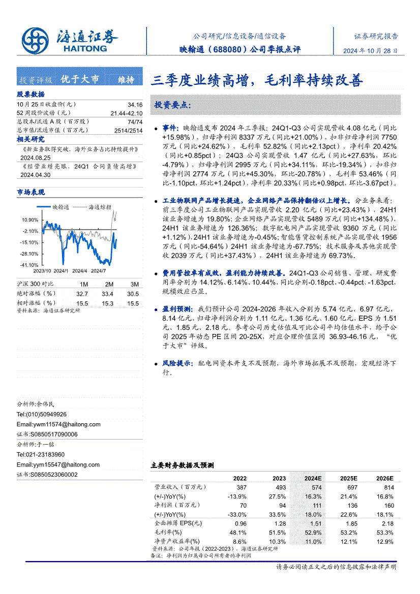 映翰通:海通证券-映翰通-688080-公司季报点评:三季度业绩高增,毛利率持续改善-241028