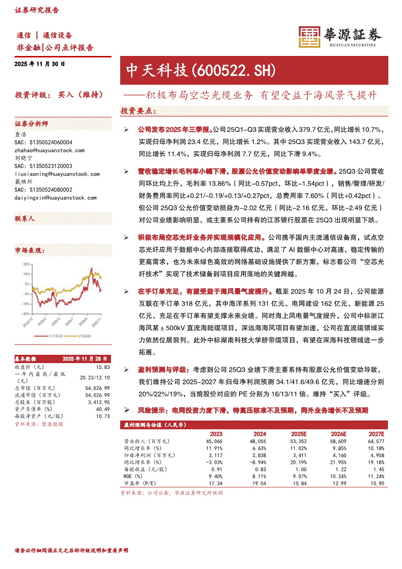 中天科技:华源证券-中天科技-600522-积极布局空芯光缆业务,有望受益于海风景气提升-251130
