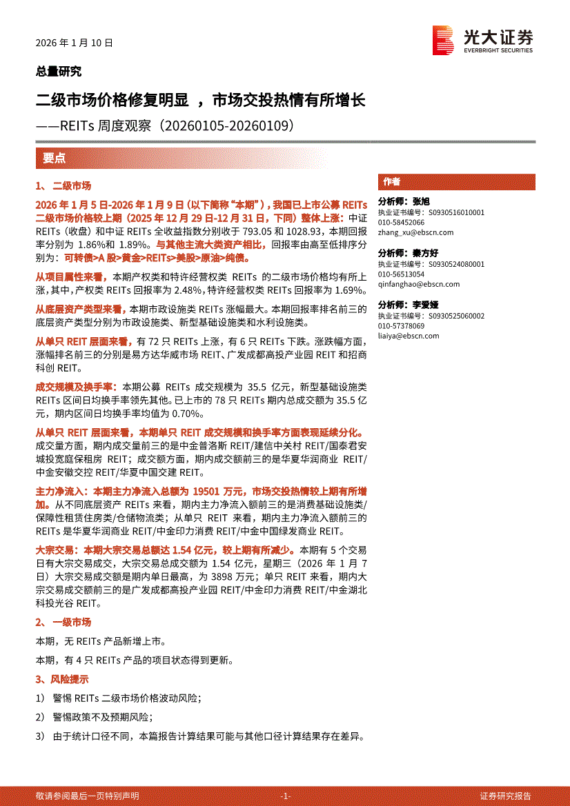 光大证券-REITs周度观察:二级市场价格修复明显,市场交投热情有所增长-260110