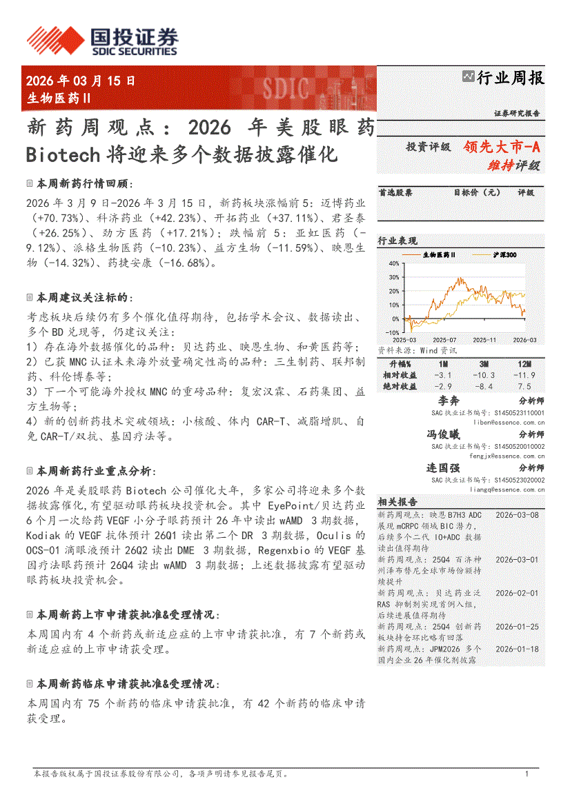 生物医药行业:国投证券-生物医药Ⅱ行业新药周观点:2026年美股眼药Biotech将迎来多个数据披露催化-260315