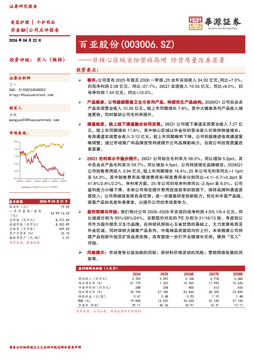 百亚股份:华源证券-百亚股份-003006-非核心区域省份营收高增,经营质量改善显著-260422