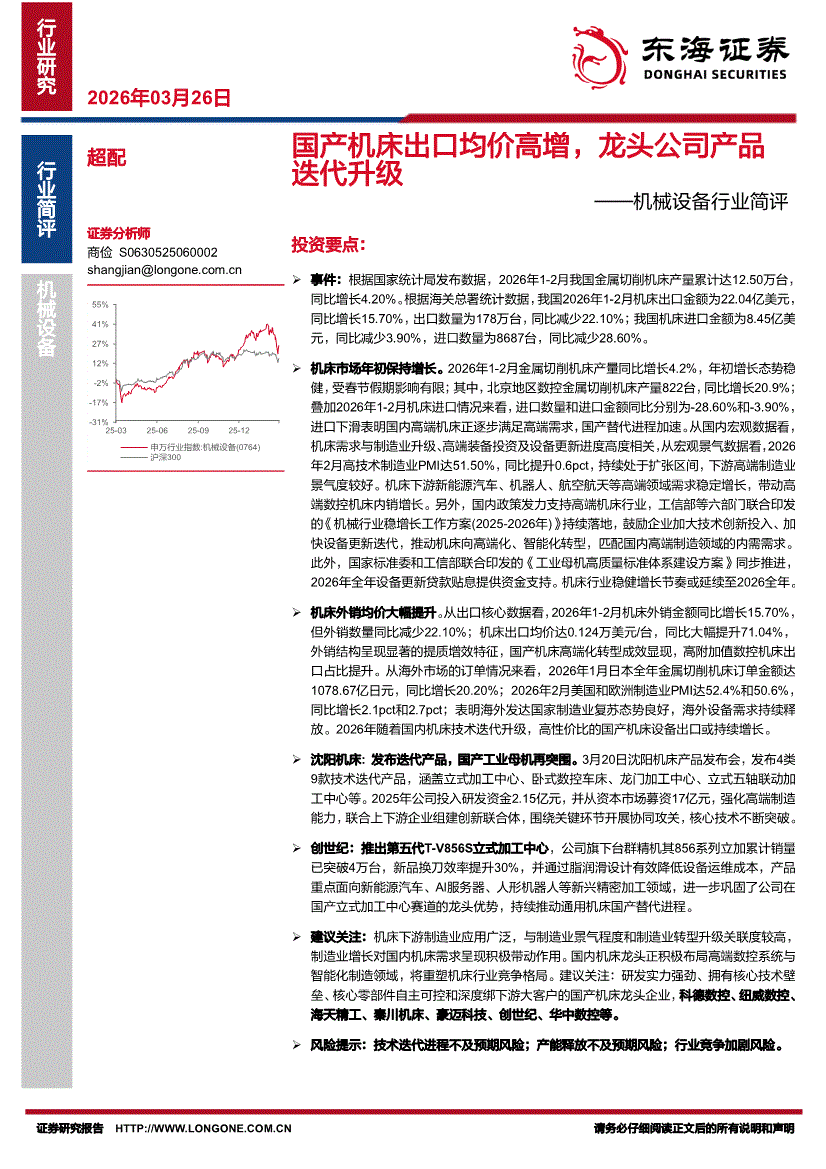 机械设备行业:东海证券-机械设备行业简评:国产机床出口均价高增,龙头公司产品迭代升级-260326