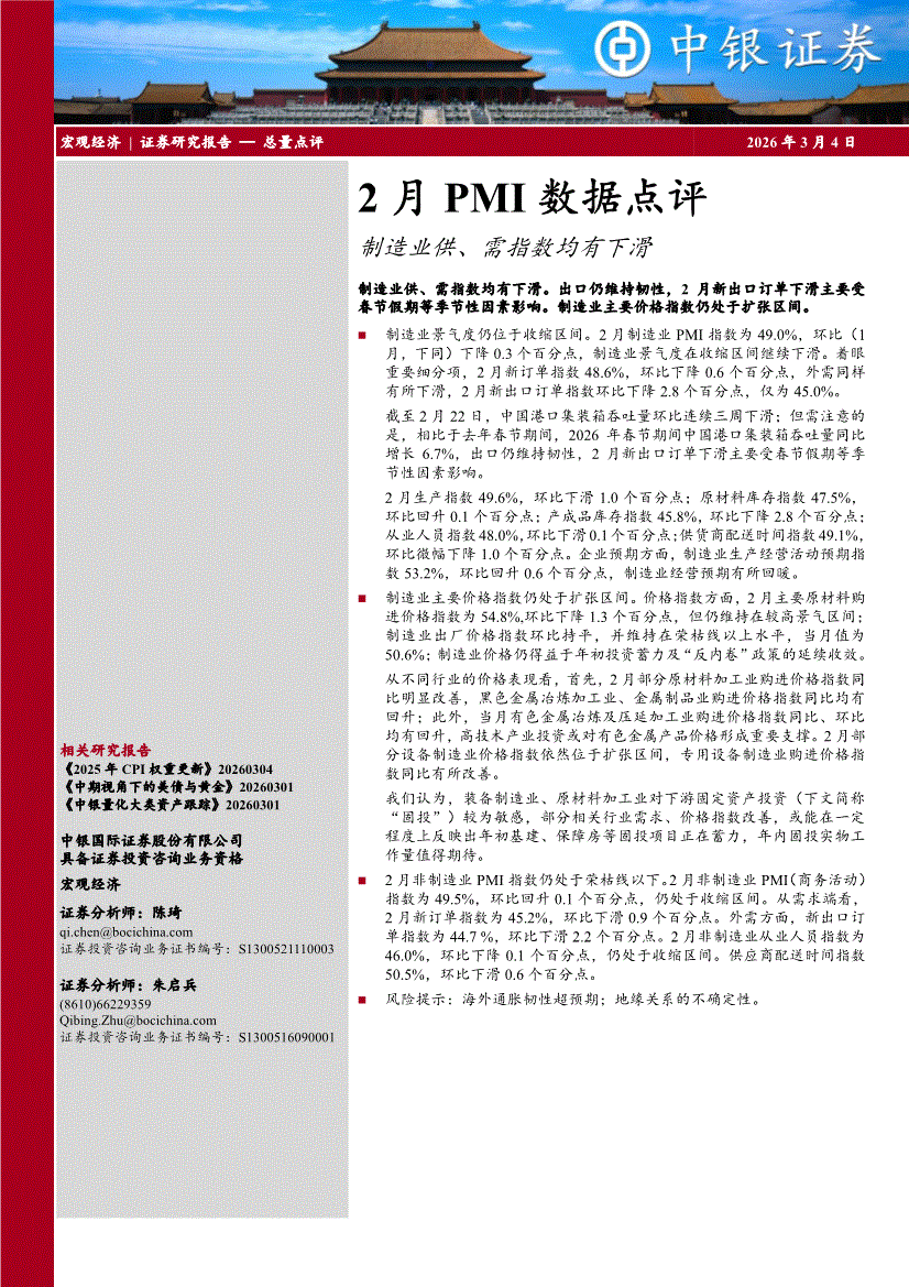 中银国际-2月PMI数据点评:制造业供、需指数均有下滑-260304