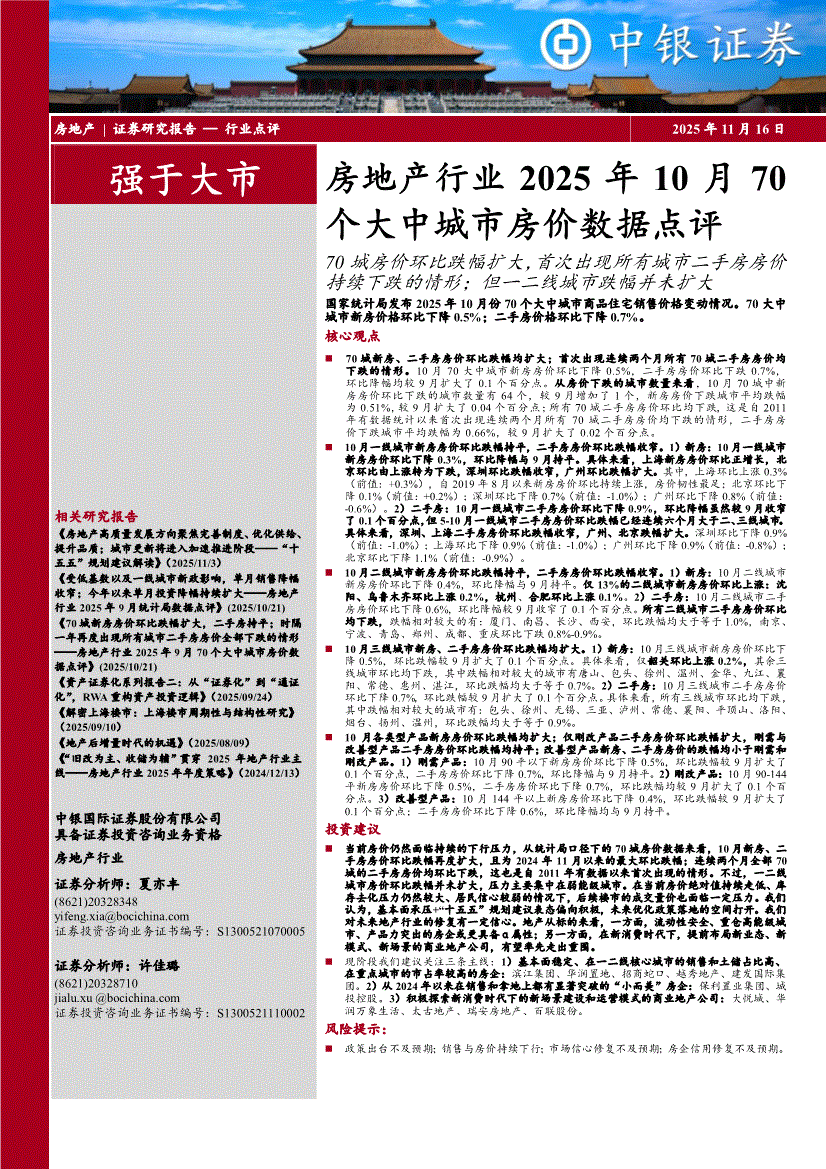 房地产行业:中银国际-房地产行业2025年10月70个大中城市房价数据点评:70城房价环比跌幅扩大,首次出现所有城市二手房房价持续下跌的情形;但一二线城市跌幅并未扩大-251116