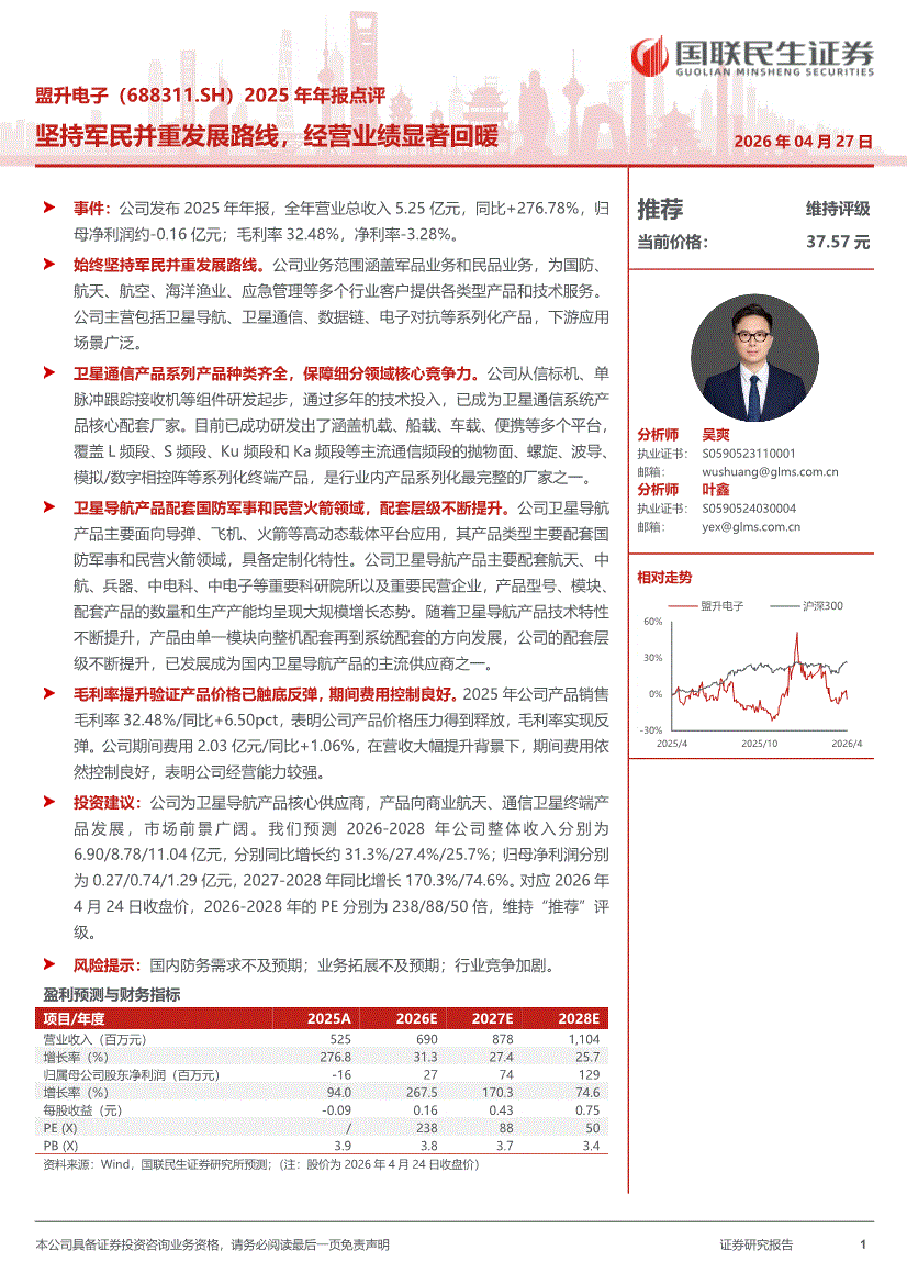 盟升电子:国联民生证券-盟升电子-688311-2025年年报点评:坚持军民并重发展路线,经营业绩显著回暖-260427
