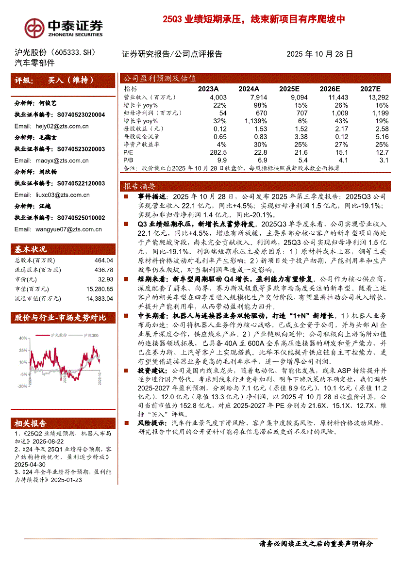 沪光股份:中泰证券-沪光股份-605333-25Q3业绩短期承压,线束新项目有序爬坡中-251028