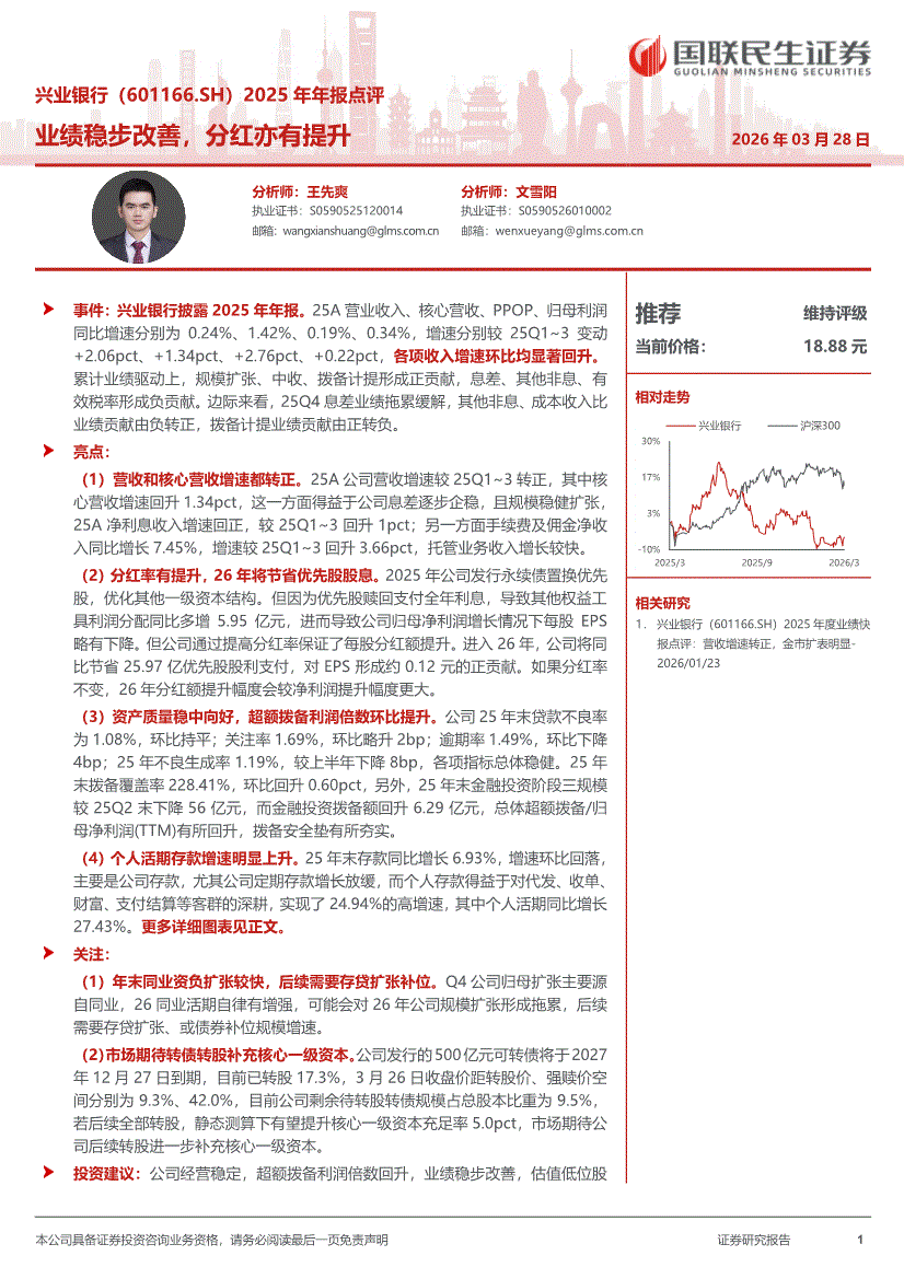 兴业银行:国联民生证券-兴业银行-601166-2025年年报点评:业绩稳步改善,分红亦有提升-260328