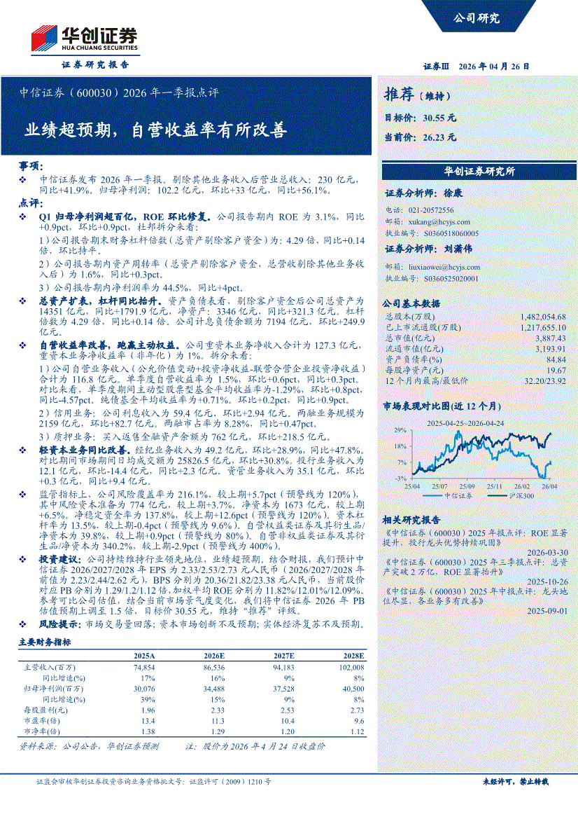 中信证券:华创证券-中信证券-600030-2026年一季报点评:业绩超预期,自营收益率有所改善-260426