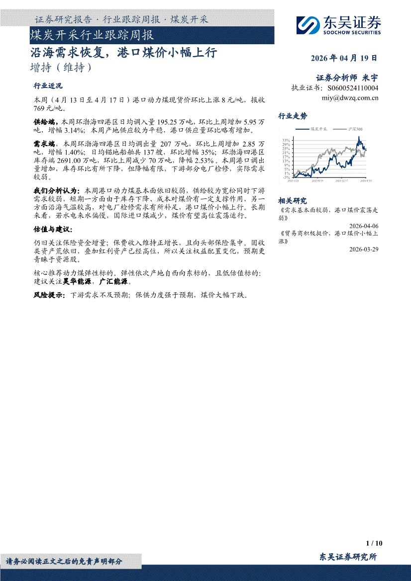 煤炭开采行业:东吴证券-煤炭开采行业跟踪周报:沿海需求恢复,港口煤价小幅上行-260419