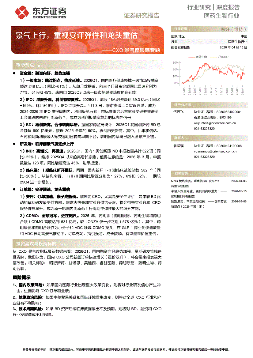 医药生物行业:东方证券-医药生物行业CXO景气度跟踪专题:景气上行,重视安评弹性和龙头重估-260415