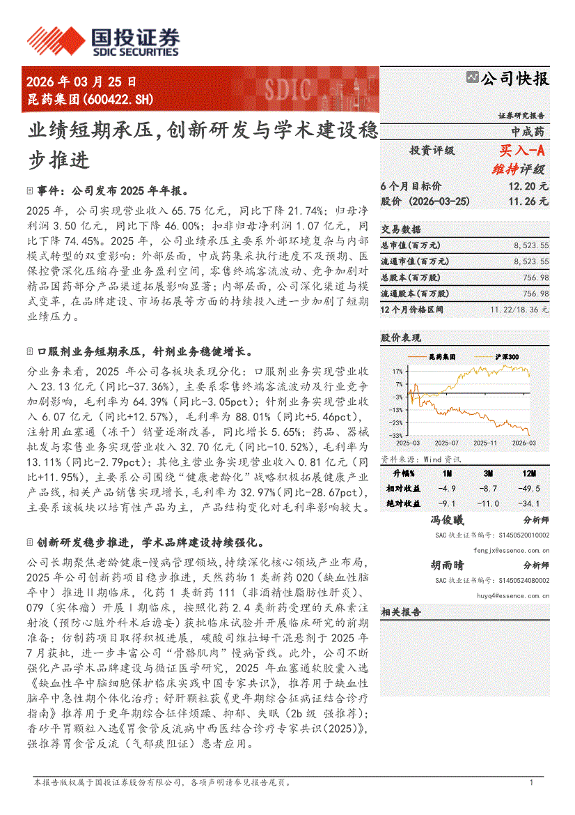 国投证券-昆药集团-600422-业绩短期承压,创新研发与学术建设稳步推进-260325