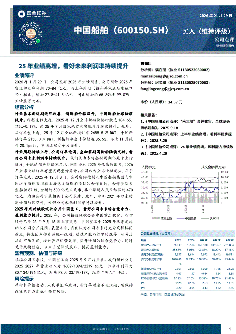 中国船舶:国金证券-中国船舶-600150-25年业绩高增,看好未来利润率持续提升-260129