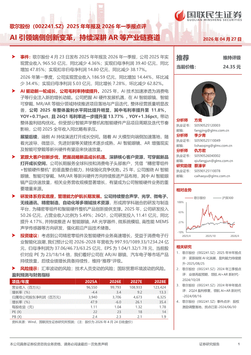 歌尔股份:国联民生证券-歌尔股份-002241-2025年年报及2026年一季报点评:AI引领端侧创新变革,持续深耕AR等产业链赛道-260427